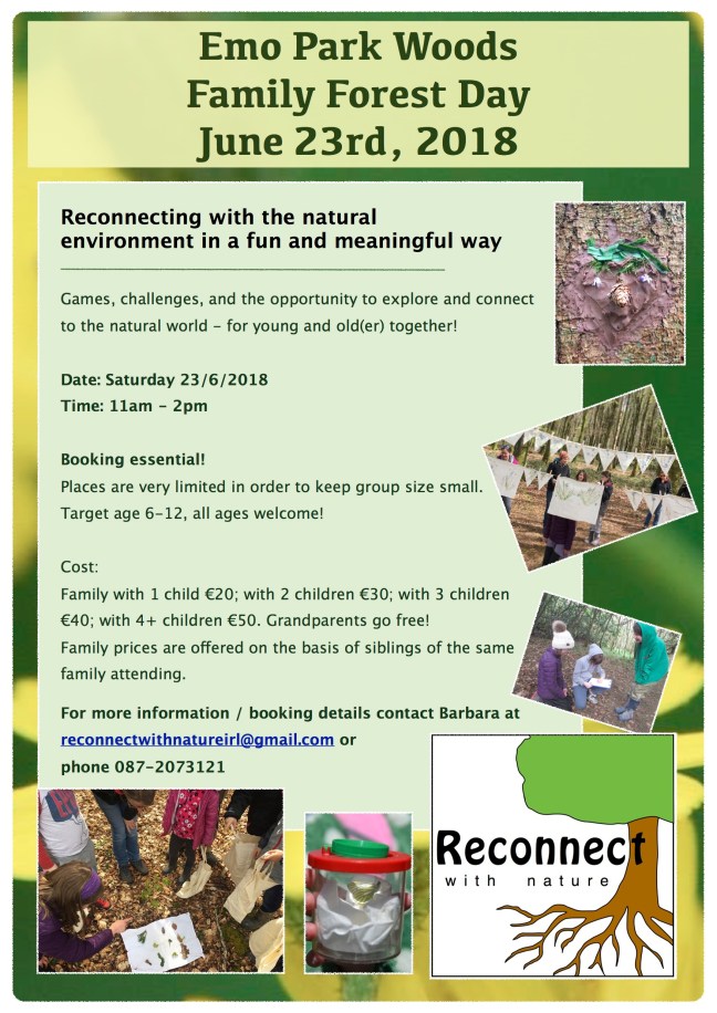Emo June Family Forest Day Posted on June 7, 2018June 7, 2018 by reconnectwithnatureireland Booking form here: https://goo.gl/forms/fZut6REaX8PZbe1O2 Share this: Click to share on X (Opens in new window) X Click to share on Facebook (Opens in new window) Facebook Like Loading... Related
