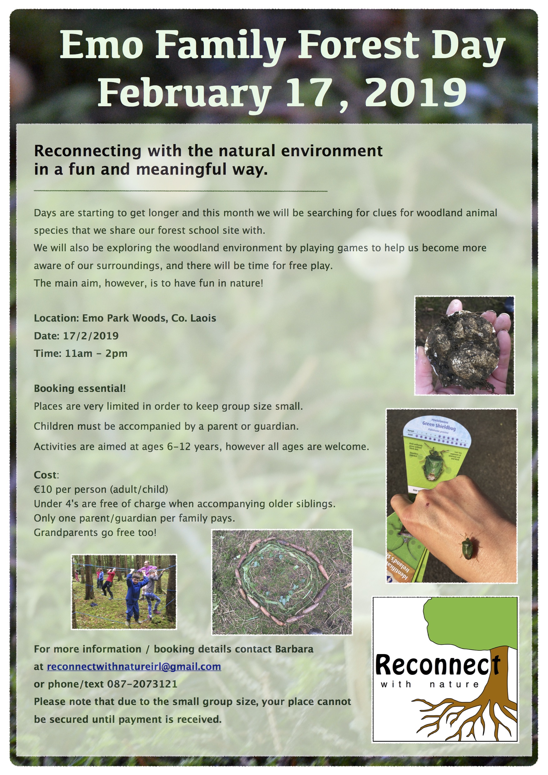 Emo Woods Family Forest Day – February 17th, 2019 Posted on January 24, 2019 by reconnectwithnatureireland Book here Share this: Click to share on X (Opens in new window) X Click to share on Facebook (Opens in new window) Facebook Like Loading... Related